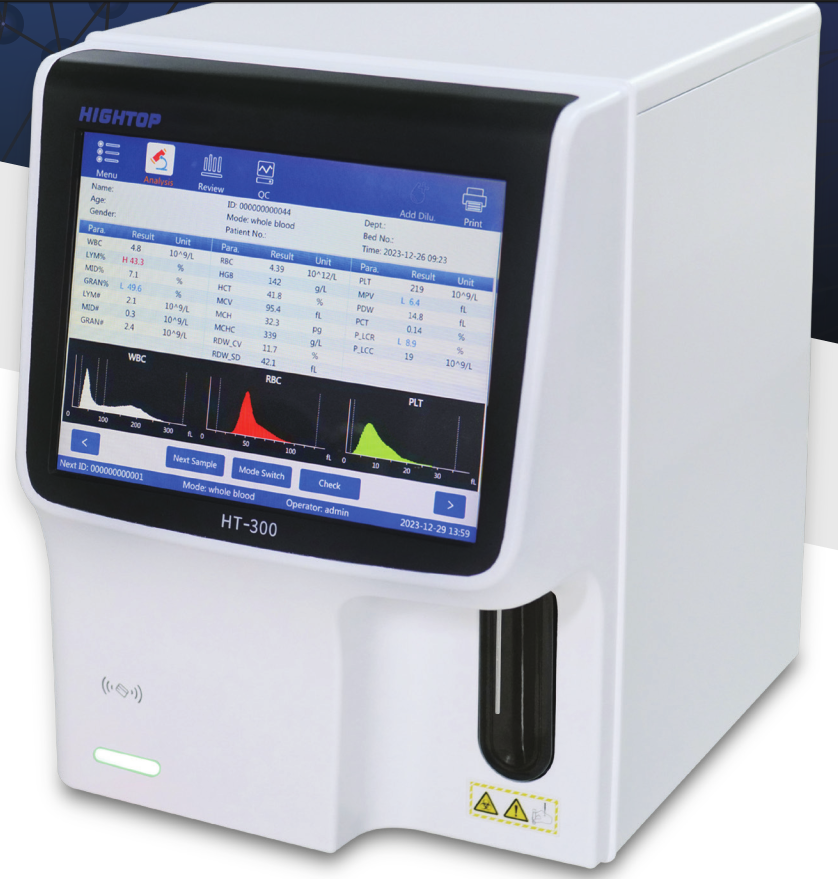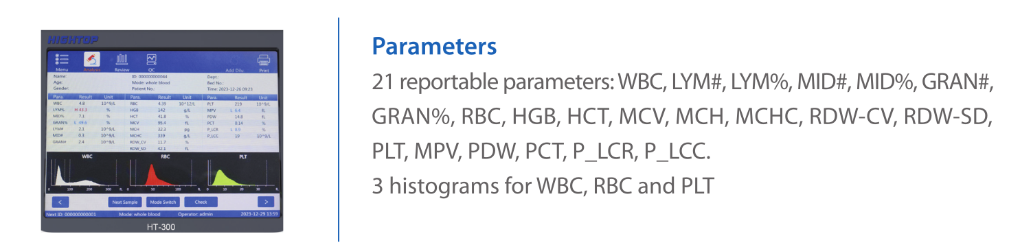 Analizador Diferencial de 3 partes, * Hasta 60 pruebas / hora * 21 parámetros/3 histogramas *Método de impedancia eléctrica de doble canal para conteo de células *Método colorimétrico para determinación de HGB *Solución lisante libre de cianuro *Volumen de muestra bajo, bajo consumo de reactivo *Sangre venosa total/ sangre capilar 9.8 ul/ prueba *Modo prediluido con 20 ul / prueba *Pantalla táctil a color, alta definición de 10.1 ” *Programa amigable e inteligente