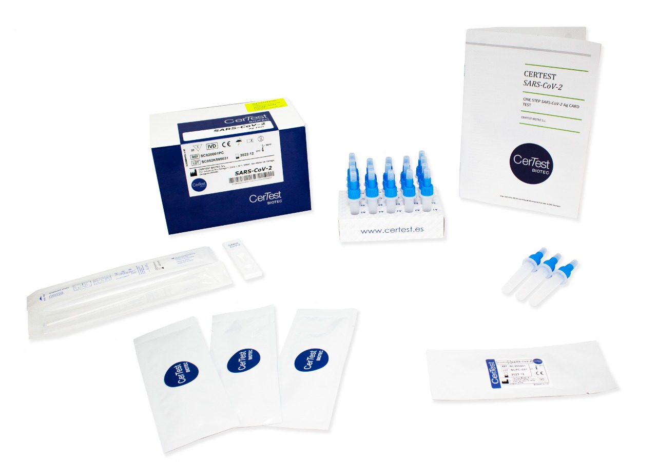 La Prueba CerTest SARS-CoV-2 Antigen card test es un inmunoensayo cromatográfico rápido y confiable para la detección cualitativa de antígenos específicos de SARS-CoV-2 presentes en la nasofaringe humana. Esta prueba es una ayuda para detectar el Antígeno del virus SARS-CoV-2 en individuos sospechosos de COVID-19. Este producto está estrictamente diseñado para uso profesional en laboratorios y entornos de puntos de atención.