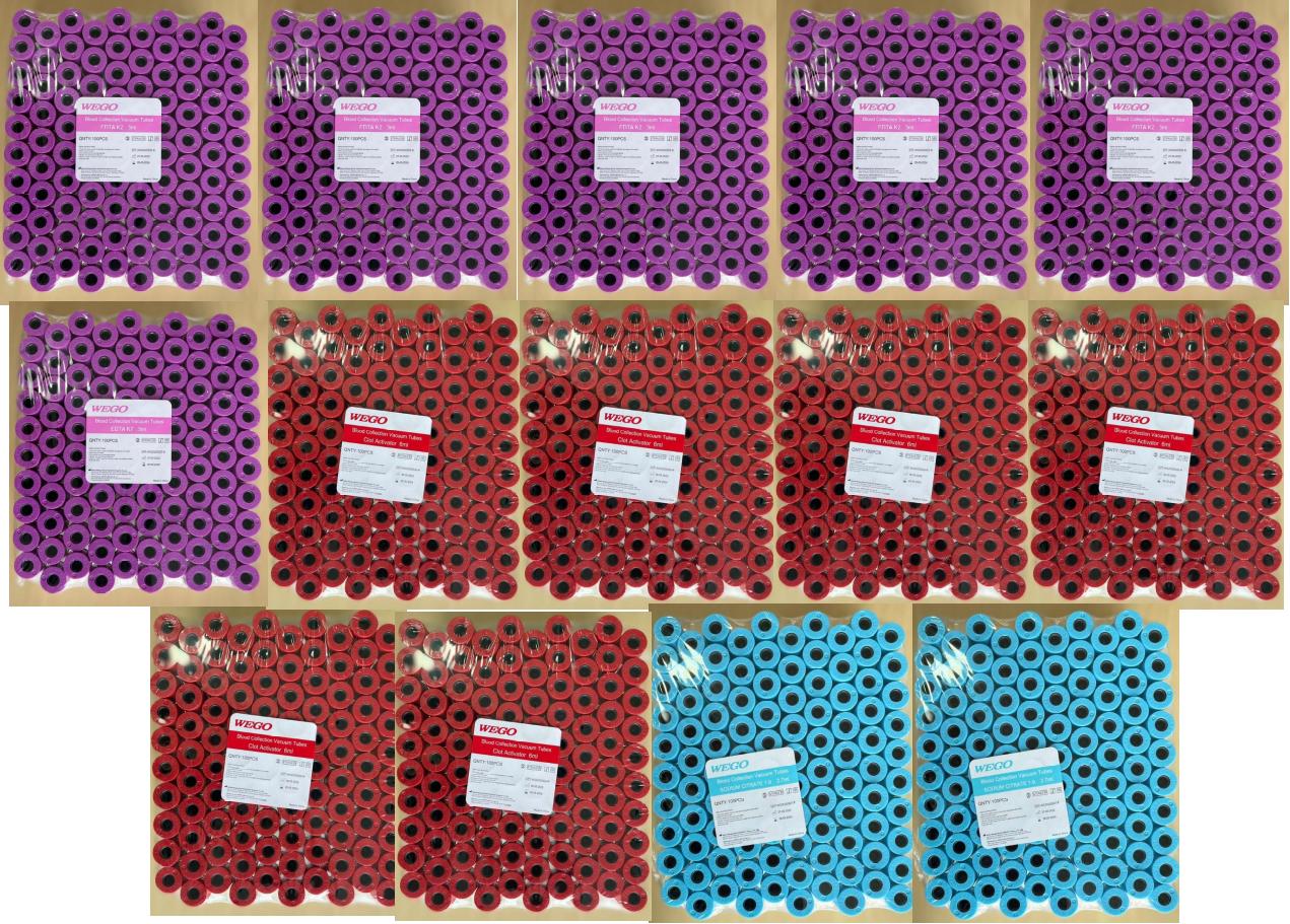 Paquete de tubos para muestras sanguinea, incluye 6 Gradillas de tubo Lila, 6 Gradillas de tubo Rojo y 2 Gradillas de tubo Azul, 1400 tubos en total, Caducidad 2024.