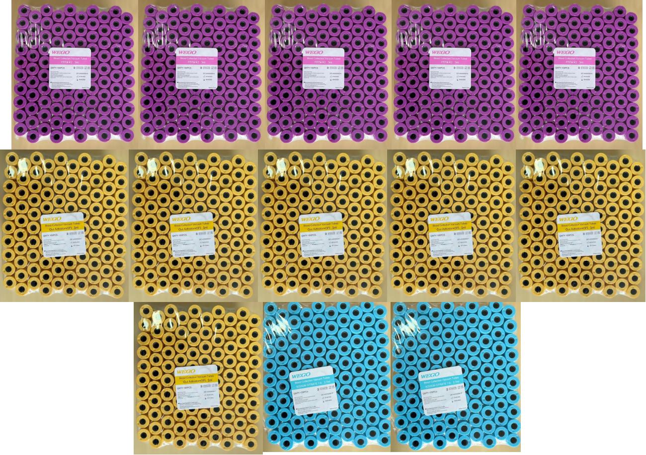 Paquete de tubos para muestras sanguinea, incluye 5 Gradillas de tubo Lila, 6 Gradillas de tubo Amarillo y 2 Gradillas de tubo Azul, 1300 tubos en total, Caducidad 2024.