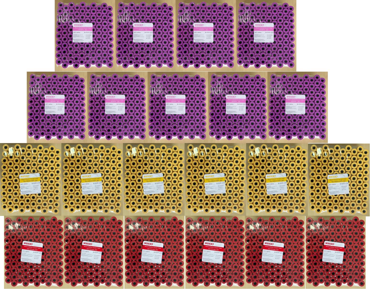 Paquete de tubos para muestras sanguínea, incluye 9 Gradillas de tubo Lila, 6 Gradillas de tubo Amarillo y 6 Gradillas de tubo Rojo, 2100 tubos en total, Caducidad 2024.