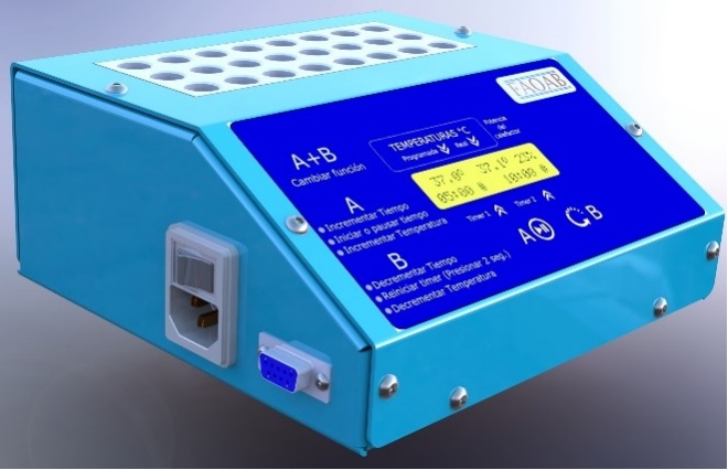 El Thermoblock es de diseño compacto, con un control de temperatura desde 20°C hasta 40°C, con 2 timers para el monitoreo de tiempo de una segunda prueba simultánea. Consta de un bloque de aluminio con capacidad para 24 tubos de ensayo de 12 milímetros de diámetro, un display de 16 filas x 2 columnas. El display muestra la temperatura actual del Thermoblock, la temperatura programada, una barra que indica la potencia del calefactor, además de una alarma que suena al